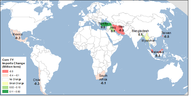 Ожидается, что импорт нескольких стран, закупающих кукурузу из Аргентины, будет ограничен снижением запасов и экспорта Аргентины. Прогнозируемый импорт кукурузы снижен на 0,5 млн. тонн для таких традиционных покупателей, как Иран, Тайвань и Малайзия, а для Чили — на 0,3 млн. тонн. Импорт кукурузы в Мексику отстает от прогноза и сокращен на 0,3 миллиона тонн. Южная Африка при увеличении производства сокращена на 0,1 млн. тонн. Эти изменения частично компенсируются увеличением ожидаемого импорта кукурузы для Турции на 0,5 млн. тонн, а также для Бангладеш и Ирака – на 0,1 млн. тонн для каждой из стран.