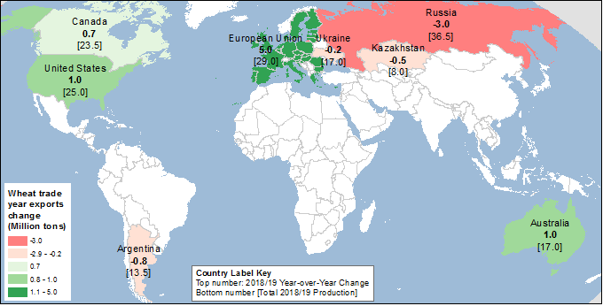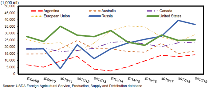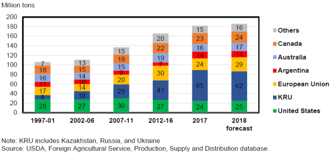 Россия и Украина увеличивали долю экспорта пшеницы с начала 2000-х годов, наряду с ЕС, их основным конкурентом и ведущим мировым экспортером с 2013/2014 по 2015/16 гг. В 2018/19 году прогнозируется, что ЕС будет наращивать свои низкие экспортные показатели текущего 2017/18 года и, по крайней мере, частично восстановит прежний статус. Получив 4 подряд урожайных года, Россия стала крупнейшим мировым экспортером пшеницы в 2017/18 году и, согласно прогнозу, сохранит этот статус в 2018-19 году. В Аргентине недавняя отмена налогов и квот на экспорт пшеницы в 2015/16 году, которые обременяли фермеров в течение последних 15 лет, а также сильное обесценивание валюты (песо), как ожидается, увеличат объем производства пшеницы и экспорт в 2018/19 году. Достижения ЕС, Аргентины, России и Украины на мировом рынке пшеницы в последние годы происходят в основном за счет Соединенных Штатов, доля которых в мировой торговле пшеницей снижается.