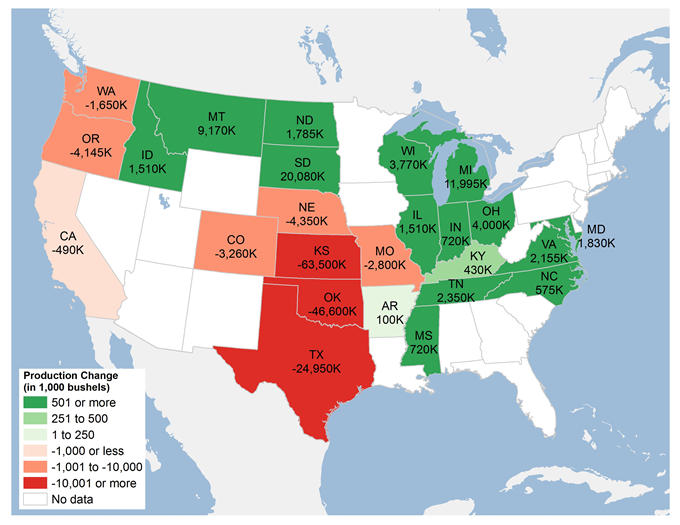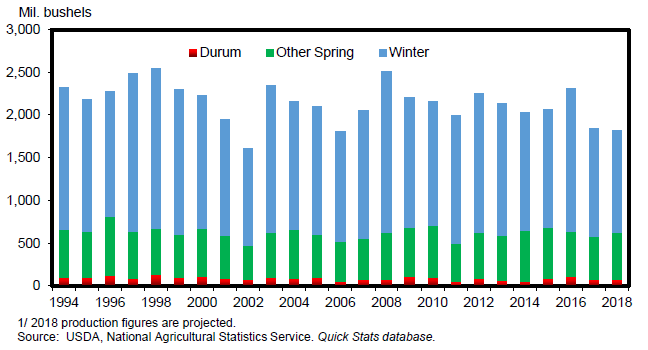 o USDA, Национальная служба сельскохозяйственной статистики (NASS) прогнозирует производство озимой пшеницы на уровне 1191,5 млн. бушелей, что на 6 процентов меньше, чем в 2017/18 году, на основе снижения урожайности и коэффициента сбора урожая, несмотря на рост посевной площади озимой пшеницы.
