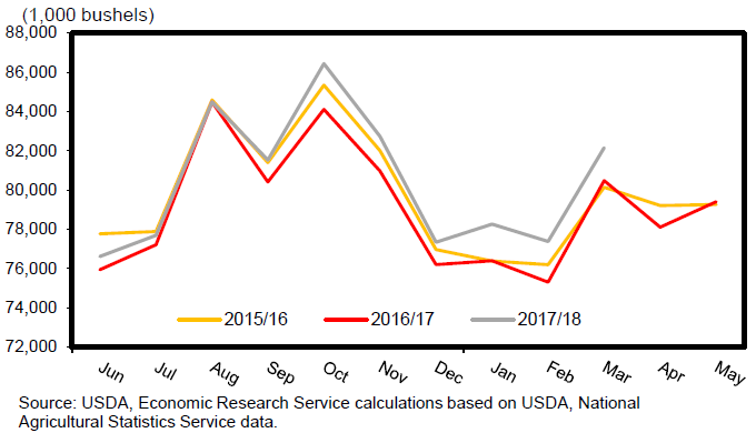 С учетом доступных данных о производстве муки по март 2018 года, имеются все признаки того, что спрос будет оставаться устойчивым в четвертом квартале (март-май). Как правило, использование пшеницы для производства муки растет в четвертом квартале. Четвертый квартал, как правило, включает в себя дополнительный день или два, что объясняет рост пищевого потребления на 1-2% по сравнению с предыдущим кварталом. Кроме того, Пасха – традиционный день потребления рулетов, печенья и праздничных куличей – отмечалась позже в этом году (1 апреля), что послужило толчком для роста потребления в марте, поскольку семьи готовились к празднику.