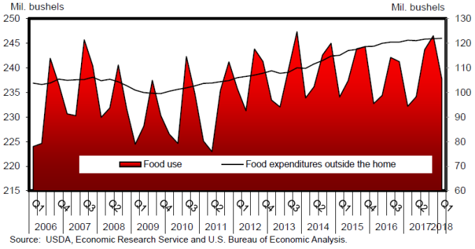 Наконец, данные Бюро экономического анализа США показывают, что реальные потребительские расходы, обусловленные ростом доходов, неуклонно повышаются и поддерживают рост расходов на питание и жилье. Использование пшеничных продуктов возрастает по мере увеличения трат на питание вне дома (рис.5). Соответственно, недавний подъем потребления пшеницы может быть частично обусловлен увеличением спроса на общественное питание, например, рестораны быстрого питания. В 2018 году прогнозируется устойчивый рост ресторанной индустрии, который, в свою очередь, поддерживает скорректированную оценку пищевого использования пшеницы в 2017/18 году на уровне 963 миллионов бушелей, а также обновленный прогноз пищевого потребления на 2018/19, который в настоящее время составляет 965 миллионов бушелей.