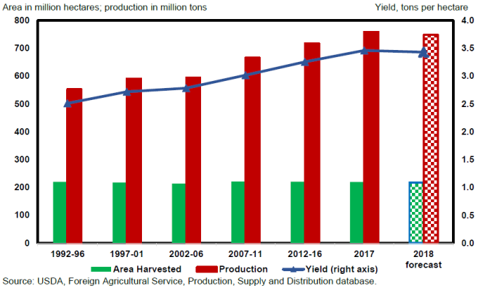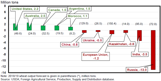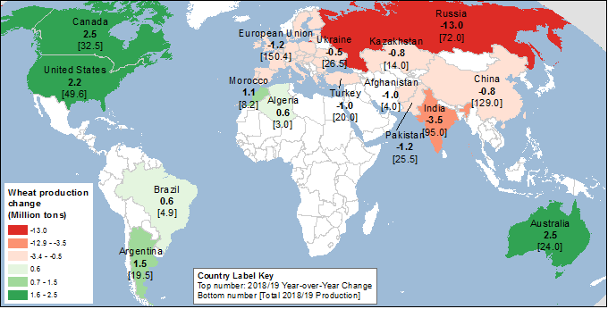 Прогнозируемое сокращение производства пшеницы в 2018-19 году в основном связано с Россией и Индией, хотя более высокий прогноз производства пшеницы для США, Австралии, Канады, Аргентины, региона Северной Африки и некоторых стран Ближнего Востока частично компенсирует падение в этих двух странах. Большая часть изменений обусловлена прогнозируемым возвратом к нормальной или трендовой урожайности после рекордов 2017/18 года. Ожидается, что Россия и Индия отступят от рекордной благодаря погоде урожайности, в то время как Австралия, как ожидается, восстановится после неблагоприятных погодных условий в 2017/18 году.
