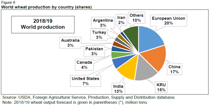 Согласно прогнозу, в 2018-19 году российский экспорт сократится до 36,5 млн. тонн, хотя статус страны как крупнейшего в мире экспортера останется нетронутым. В то время как объем экспорта США немного вырастет в 2018/19 году, Европейский союз будет экспортировать больше пшеницы, уступая только России.