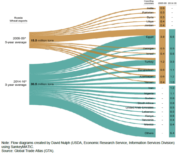 Более высокие объемы экспорта связаны с перераспределением импортеров. В течение последних нескольких лет Россия и Украина расширили свою деятельность, частично (а иногда и полностью), заменив США, Австралию и Канаду на нескольких рынках. Ярким примером является Египет, один из ведущих импортеров пшеницы в мире. Египет раньше импортировал большую часть пшеницы из Соединенных Штатов, но в последние несколько лет сменил основной источник своего импорта на Россию и Украину. Аналогичная ситуация сейчас происходит с Нигерией.