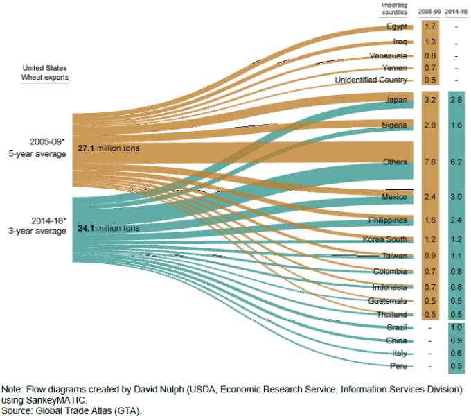 Диаграмма 2. США: экспортные потоки пшеницы за 2005-09 годы (среднегодовые) и за 2014-16 годы (среднегодовые).