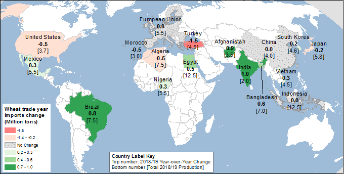 Мировая торговля пшеницей (торговый год с июля по июнь) составит 187,6 млн. тонн, что на 39 млн. или 2,1% больше, чем в прошлом году. Однако ожидается, что объемы импорта и экспорта по странам изменятся. Несмотря на рост производства пшеницы в ряде стран-импортеров и ожидаемое сокращение кормового потребления пшеницы в ответ на более высокие цены на пшеницу, спрос и импорт пшеницы поддерживаются растущим населением, главным образом в странах с низким уровнем дохода, а также растущей долей пищевого потребления пшеницы в странах, которые традиционно потребляют рис. На приведенной ниже карте наглядно показаны объемы и изменения импорта пшеницы за год.