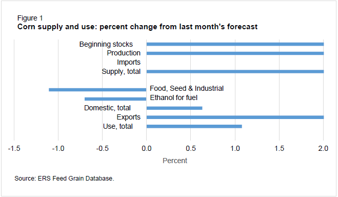 Рисунок 1. Предложение и потребление кукурузы: изменение в процентах по сравнению с прогнозом прошлого месяца (начальные запасы, производство, импорт, совокупные запасы, использование на корм, семена и в промышленности, производство топливного этанола, совокупное внутреннее потребление, экспорт, общее использование).