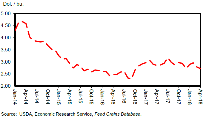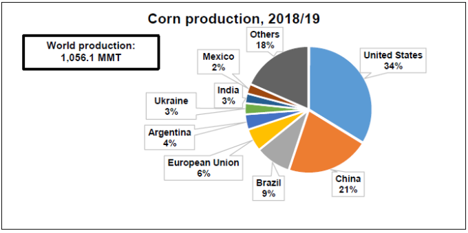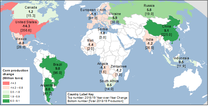 Урожай кукурузы в 2018/19 году в США прогнозируется на уровне 14,0 млрд. бушелей в связи с уменьшением площади и снижением урожайности. Запасы будут на 675 млн. бушелей ниже прошлогоднего показателя на уровне 16,3 млрд. бушелей. Сокращение кормового, остаточного использования и перспектив экспорта частично компенсируется ростом использования кукурузы для производства этанола, в результате чего исчезновение снизится на 175 миллионов бушелей до 14,6 миллиарда бушелей. Конечные запасы оцениваются в 1,7 миллиарда бушелей, что на 500 миллионов меньше, чем в прошлом году. Средняя точка прогнозируемого ценового диапазона составляет 3,80 долл. США за бушель, что на 0,40 долл. выше, чем в прошлом сезоне.