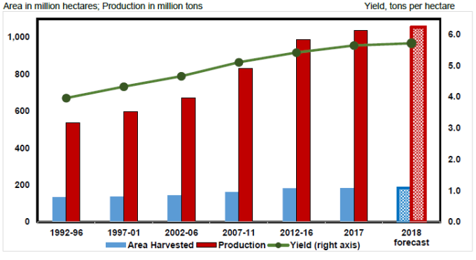 Рисунок 11. Мировая площадь кукурузы, производство и урожайность: средние за 5 лет, 2017 год и прогноз на 2018 год