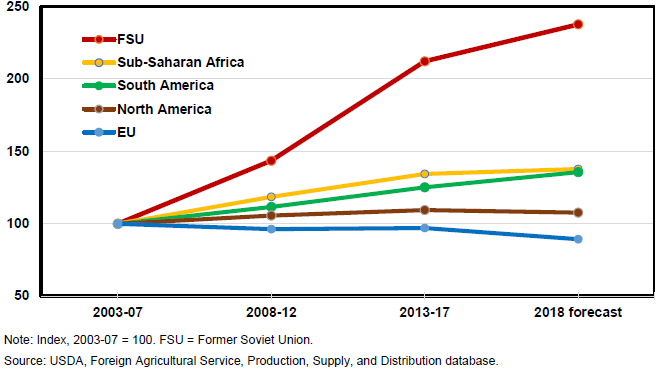 Со временем площадь кукурузы и урожайность изменяются неравномерно среди регионов мира, и наиболее быстрыми темпами расширяются площади кукурузы в двух странах бывшего Советского Союза, Украине и России, которые в прошлом производили небольшие объемы кукурузы. После начала 1990-х годов, когда бывшие колхозы были вынуждены реорганизоваться, требование о самофинансировании и новая свобода принятия решений, которых они ранее были лишены, позволили этим фермам перейти на более прибыльные культуры, главным образом кукурузу, подсолнечник и соевые бобы, за счет ржи, ячменя, овса и пастбищ. Обе страны стали более интегрированными в мировую сельскохозяйственную экономику, так что торговля, иностранные инвестиции в сельское хозяйство и передача технологий расширились. Все эти события способствовали расширению площади кукурузы и росту урожайности (см. рисунок 12). Обе страны стали крупными импортерами гибридного кукурузного семени, и их собственная семенная промышленность растет. Эти страны стали крупными экспортерами кукурузы, при этом совокупный экспорт обеих стран претерпел пятикратное увеличение за последнее десятилетие. Украина стала крупнейшим экспортером кукурузы, после США, Бразилии и Аргентины. Согласно прогнозу, в 2018/19 году Украина и Россия произведут 83,7 млн. тонн кормового зерна, из которых 49,0 млн. тонн – кукуруза и 26,0 млн. тонн – ячмень.