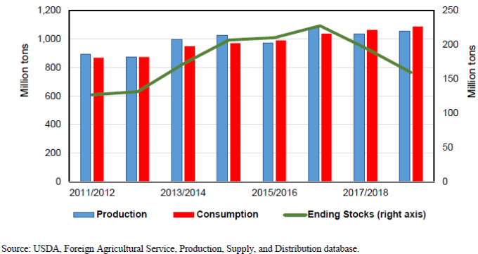 Кормовое и остаточное использование для четырех кормовых зерновых (кукуруза, сорго, ячмень и овес) и пшеницы на 2018/19 год, для маркетингового года с сентября по август, прогнозируется на уровне 143,6 млн. тонн, что на 2,7 млн. меньше, чем в 2017/18 году. Сокращение ожидается для кукурузы и овса, в то время как кормовое использование пшеницы вырастет.