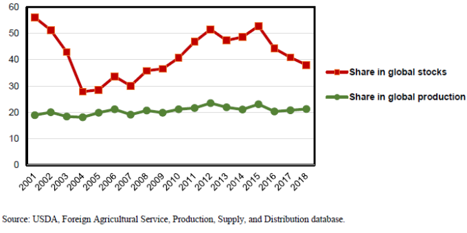 Снижение запасов кукурузы за пределами США главным образом произойдет за счет Китая, где прогнозируется существенное снижение на 24 процента, или 19,1 млн. тонн. Согласно прогнозу, доля Китая в мировых запасах кукурузы упадет до 38 процентов с почти 53 процентов 3 года назад (2015/16), когда еще не начались политические реформы, направленные на сокращение крупных государственных запасов кукурузы. Тем не менее, в середине 2000-х годов доля Китая в общем объеме запасов упала до 28 процентов; более того, доля Китая в мировых запасах все еще намного выше (почти вдвое), чем ее доля в мировом производстве кукурузы. Предыдущее снижение запасов кукурузы произошло после присоединения Китая к Всемирной торговой организации в 2001 году (см. рисунок 15).