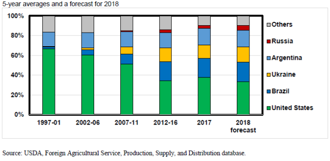 В мировом производстве кукурузы доминируют восемь стран (регионов), которые производят более 80 процентов мирового объема кукурузы. Соединенные Штаты являются ведущим производителем, хотя их доля на мировом рынке, которая ранее превышала 40 процентов, снизилась до 35 процентов с 2010 года. За тот же период общая доля Бразилии и Аргентины увеличилась с 10 до 13 процентов (см. рисунок 13).