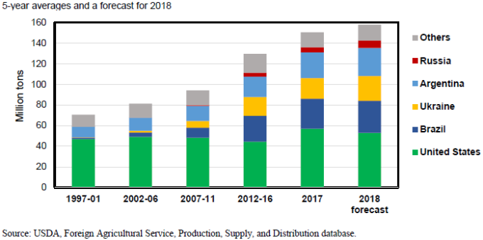 Перспективы экспорта кукурузы США в 2018/19 столкнутся с жесткой конкуренцией. Ожидается, что конкуренция со стороны Аргентины, Украины и России, чей совокупный экспорт увеличится более чем на 8 млн. тонн в 2018/19 году, будет способствовать снижению экспорта США. С другой стороны, перспективы экспорта кукурузы из США на 2018/19 год начинают получать поддержку от нынешних плохих погодных условий в Бразилии, поскольку сухость в основных районах производства сокращает урожайность кукурузы второго урожая в 2017/18 году. Реализация бразильского урожая 2017/18 года начнется в июле-августе 2018 года и продолжится до марта 2019 года и, как ожидается, повлияет на экспортные рынки в 2018-19 году. В результате ожидается, что экспорт кукурузы из США в течение первой половины 2018/19 маркетингового года будет высоким. Ожидается, что Китай, крупнейший в мире зарубежный производитель кормовых зерновых, будет оставаться важным фактором глобального спроса на зерно. Высокие цены на сорго и ячмень, поддерживаемые активным спросом со стороны Китая, создают стимул для расширения площади по всему миру, что приведет к увеличению прогнозируемых объемов производства и посевной площади сорго и ячменя. Прогнозируется, что производство зерна будет ниже, чем его потребление второй год подряд. Сокращение мировых конечных запасов произойдет в первую очередь за счет Китая.