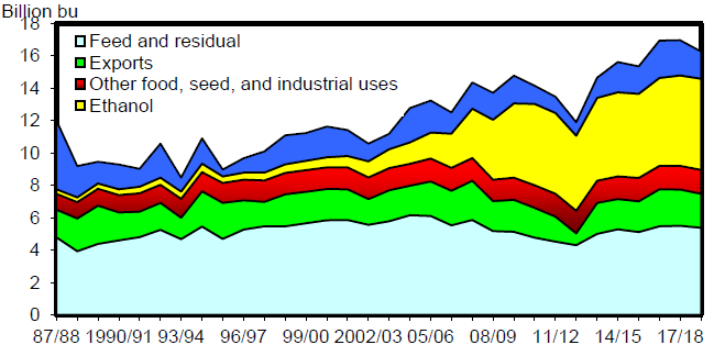 Использование в пищевых, промышленных целях и на семена (FSI) прогнозируется на 75 миллионов бушелей выше, чем в прошлом году, на рекордном уровне в 7 115 миллионов, по сравнению с 7 040 миллионами в прошлом году. В рамках FSI использование кукурузы для производства топливного этанола увеличится на 50 миллионов бушелей до 5 625 миллионов, глюкозы и декстрозы – на 20 миллионов до 400 миллионов, крахмала – на 5 миллионов бушелей до 250 миллионов. Кормовое и остаточное использование, согласно прогнозу, сократится на 125 миллионов бушелей в 2018/19 году до 5 375 миллионов на фоне роста цен на кукурузу, уменьшения урожая и более широкого использования кормов из побочных продуктов.