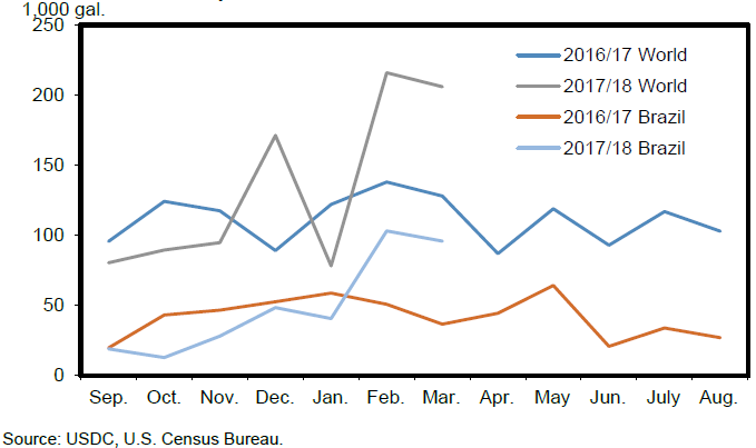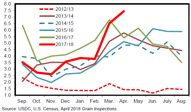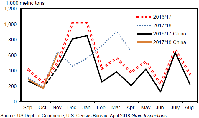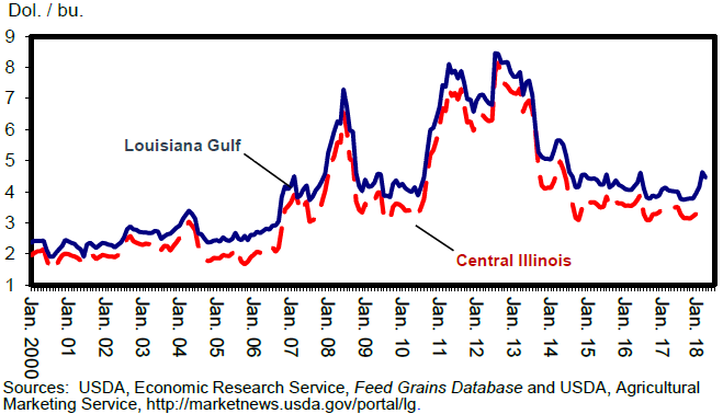 Прогнозируется, что экспорт кукурузы из США в 2018/19 году (октябрь-сентябрь) достигнет 53,0 млн. тонн, что на 4,0 млн. меньше по сравнению с пересмотренным прогнозом текущего 2017/18 года (для местного маркетингового года с сентября по август экспорт США прогнозируется на уровне 2100 млн. бушелей, по сравнению с прошлогодним в 2225 млн.). С одной стороны, ожидается, что конкуренция со стороны Аргентины, Украины и России, чей совокупный экспорт увеличится более чем на 8 миллионов тонн в 2018/19 году снизит экспорт США. С другой стороны, перспективы экспорта кукурузы из США на 2018/19 год начинают получать поддержку от плохих нынешних условий в Бразилии, поскольку сухость в основных производственных районах сокращает урожайность кукурузы второго урожая 2017/18 года. Реализация бразильского урожая 2017/18 года начнется в июле-августе 2018 года и продолжится по март 2019 года и, как ожидается, повлияет на экспортные рынки в 2018/19 торговом году (октябрь-сентябрь). Поскольку экспорт бразильской кукурузы для 2017/18 и 2018/19 международных торговых годов снижен, Соединенные Штаты начинают демонстрировать резкое улучшение экспорта.