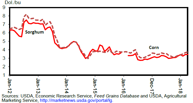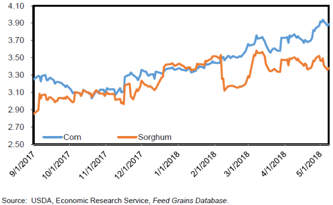 Прогнозируемый диапазон среднесезонной цены на сорго, получаемой фермерами, в 2018/19 составляет от 3,10 до 4,10 долл. США за бушель, со средней точкой в 3,60 долл. США, что на 0,40 долл. больше, чем в предыдущем году. Ограниченные запасы кормового зерна и низкие конечные запасы сорго являются причиной роста. Цена на сорго прогнозируется на уровне около 95 процентов от цены на кукурузу, которая в целом соответствует 10-летнему среднему показателю.