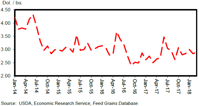 Прогнозируемая средняя цена, получаемая фермерами в 2017/18 году, повышена на 0,05 доллара США на каждом конце диапазона, который составляет от 3,25 до 3,55 долл. США за бушель со средним значением 3,40 долл. США за бушель, исходя из рыночной активности на сегодняшний день. На 2018/19 год прогнозируется диапазон от 3,30 до 4,30 долл. США со средним значением 3,80 долл. США за бушель.