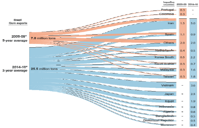 Диаграмма 1. Бразилия: экспортные потоки кукурузы в 2005-09 годах и 2014-16 годах.