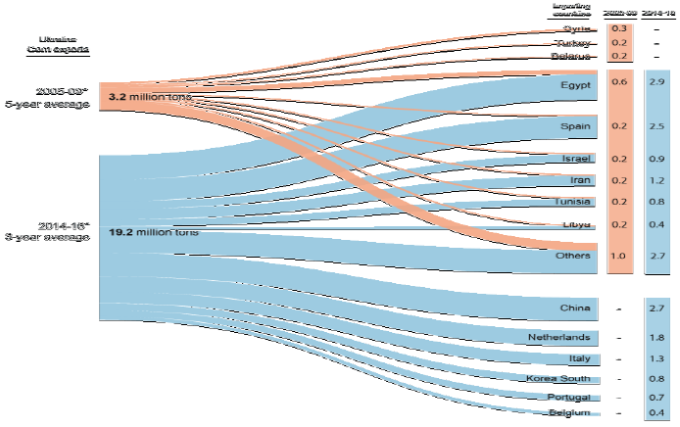 Диаграмма 2. Украина: экспортные потоки кукурузы в 2005-09 годах и 2014-16 годах.