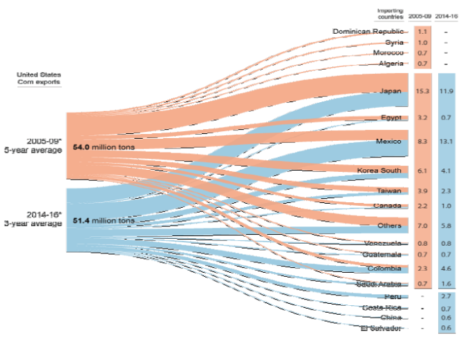 Диаграмма 3. США: экспортные потоки кукурузы в 2005-09 годах и 2014-16 годах.