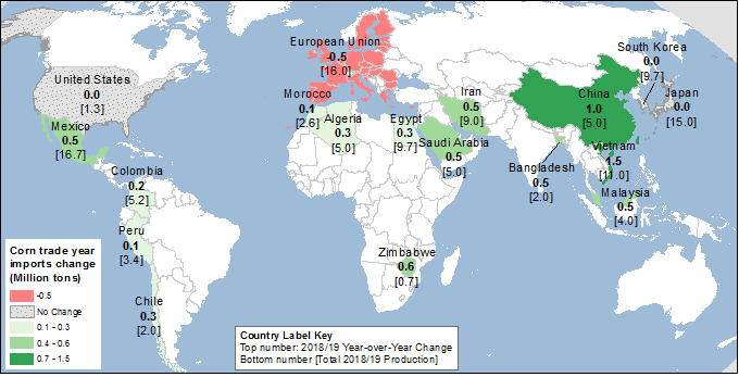 Согласно прогнозу, глобальная торговля кукурузой в 2018-19 году (октябрь – сентябрь) составит 157,6 млн. тонн, что на 7,3 млн. больше по сравнению с прогнозом торговли кукурузой на 2017/18 год. Расширение производства мяса является основным фактором роста импорта кукурузы в большинстве стран. На приведенной ниже карте можно ознакомиться с изменениями импорта кукурузы.