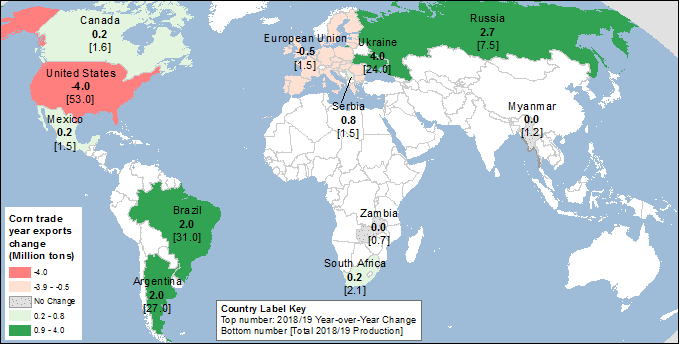 Согласно прогнозу, Аргентина с крупным урожаем в 2018/19 году увеличит экспорт на 2,0 млн. тонн до рекордных 27,0 млн., что будет обеспечено за счет высоких запасов, относительно свободного экспортного рынка и обесценения валюты (песо). Ожидается, что за пределами Южной Америки Украина, Россия и Канада увеличат экспорт кукурузы. Высокий прогнозируемый урожай, относительно низкие издержки производства и доступ к прибыльному рынку ЕС являются стимулом для экспорта украинской кукурузы. Украина также продвигается на азиатские рынки, при этом экспорт вырастет на 4,0 млн. тонн до 24,0 млн. тонн. Обильные запасы кукурузы в России поддерживают увеличение экспорта на 2,7 млн. тонн до 7,5 млн. тонн. Ожидается, что более высокий прогнозируемый объем производства кукурузы в Канаде будет способствовать увеличению экспорта кукурузы на 0,3 млн. тонн до 1,6 млн. На приведенной ниже карте изображены годовые изменения в экспорте кукурузы для крупных экспортеров.
