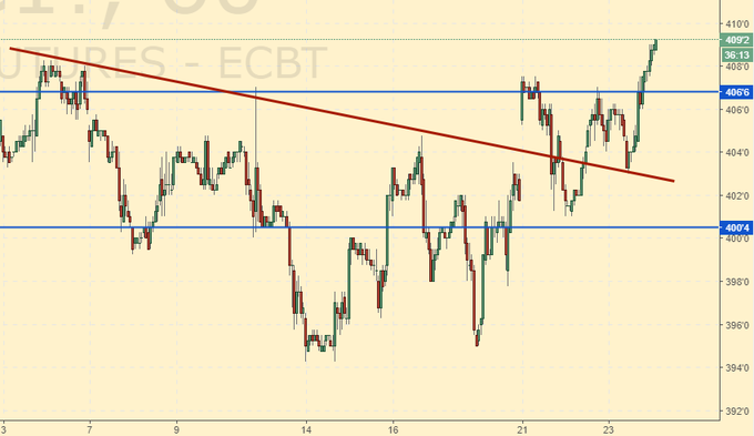 Кукуруза: после нескольких дней усилий, кукурузе удалось преодолеть притяжение поддержки 400.0, как результат мы видим новый максимум, что по всем законам жанра (волновая теория) дает нам сигнал о продолжении роста для начала к 415.0, а затем и к 430.0.