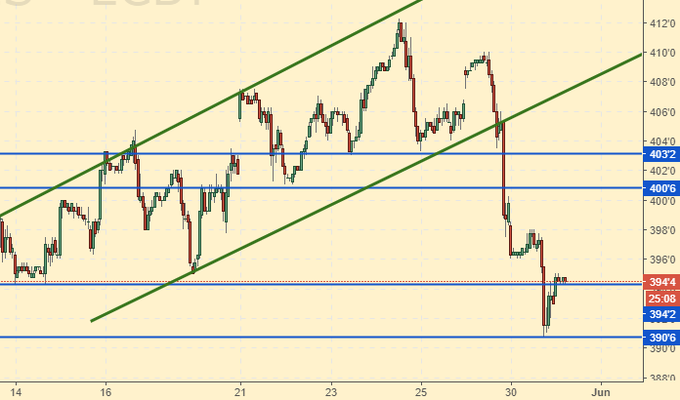 Кукуруза: после вчерашнего падения к 390.0, кукуруза выглядит еще хуже, чем пшеница. Теперь, при подъеме к 400.0, имеет смысл продавать. Будем надеяться, что рынок даст нам такую возможность. В противном случае, если цены просто упадут ниже 390.0, сброс последних двух ней рискует перерасти в обвал.