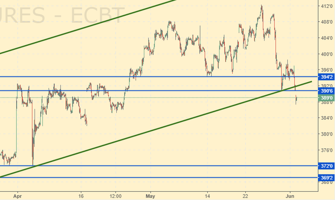 Продажа: сейчас и при касании 394.0. Стоп: 397.0. Цель: 360.0.