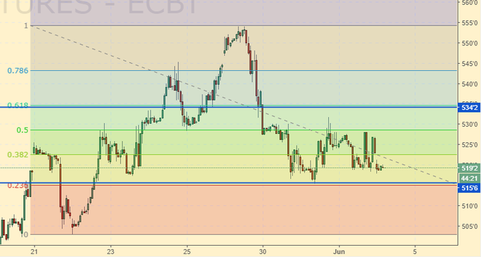 Пшеница: если рынок провалится под 515.00, то положение быков станет хуже некуда. Сразу же откроется отметка 500.00, а падение под неё может вызвать исход покупателей и цены продолжат падение. Текущая ситуация пока призывает нас покупать. Риск здесь небольшой, поэтому можно входить в лонги. В случае ухода рынка под 515.00 позиции на покупку закрыть.