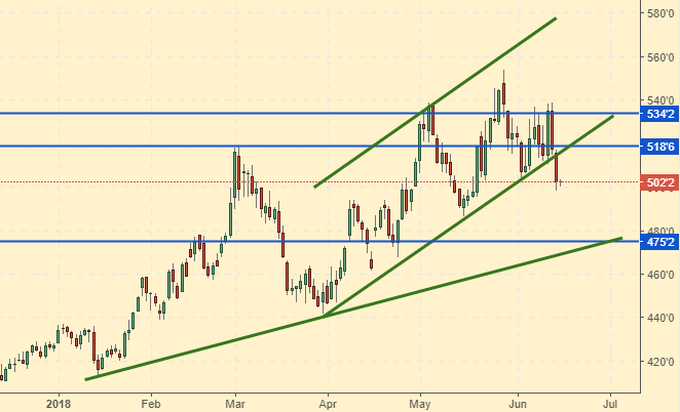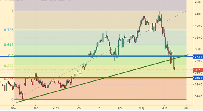 Пшеница: поскольку ценны вышли из растущего канала вниз, имеет смысл посмотреть на перспективы данного падения открыв дневной график. Как видим, цель на 475.00 вполне достижима. Но вряд ли на ней все и закончится. Возможен более глубокий ход на 450.0, который и станет нашей целью. Фундамент по пшенице на фоне большого урожая слаб. Падение доллара в ближайшее время не предвидится, а значит, только вниз.