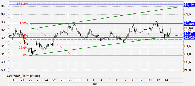Рубль: небольшое падение стоимости нефти, значительное усиление доллара, и вот мы не можем взять 62.00 (наш сигнал на продажу) и поднимаемся выше 62.50, что создает предпосылки для продолжения роста. Не смотря на болезненность закрытия по стоп-ордеру на 62.20 вчера, рекомендуем сегодня повторить вход в покупку. Сегодня заседание ЦБ РФ (13.30 Мск.). Ждем, что ставка останется на том же уровне 7.25%.