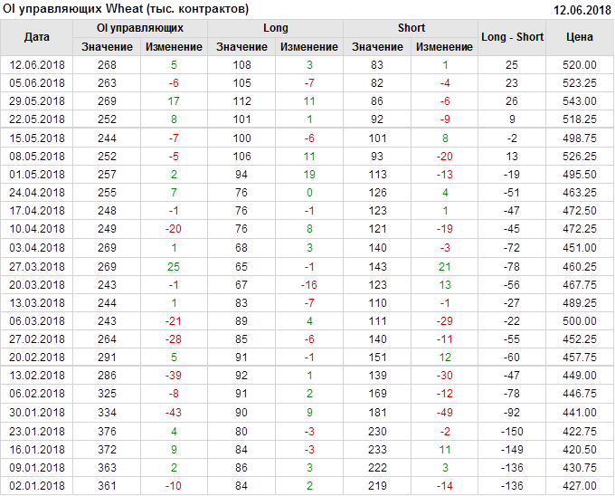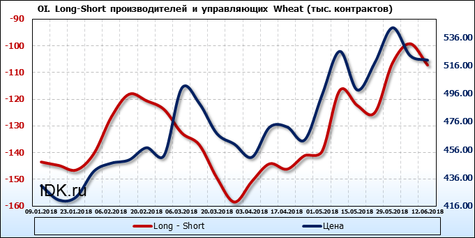 За прошлую неделю, 04.06.18 — 08.06.18, разница между длинными и короткими позициями управляющих выросла на 2 тыс. контрактов. В тоже время, цена упала на 3.25 цента. Управляющие наращивают длинные позиции, что отражает их видение возможностей роста цены в ближайшее время, и это несмотря на то, что цены на отчетной неделе падали. Если давление со стороны покупателей будет продолжено рынок развернется вверх.
