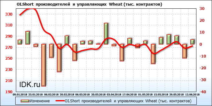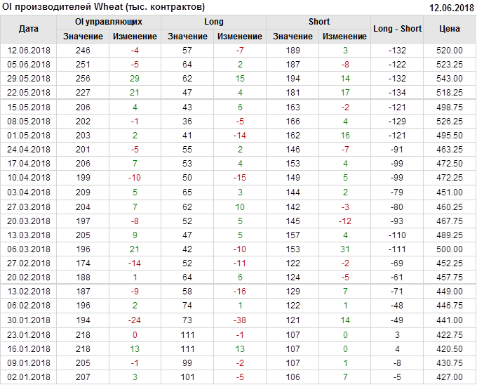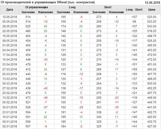 За прошлую неделю, 04.06.18 — 08.06.18, разница между длинными и короткими позициями производителей и управляющих упала на 8 тыс. контрактов. За отчетный период времени, цена упала на 3.25 цента. Производители и управляющие на отчетной недели были склонны продавать. Суммарное число шортов было выше суммарного числа лонгов. Цены также снижаются, что создает привлекательные условия для продавцов в среднесрочной перспективе, одна — две недели.