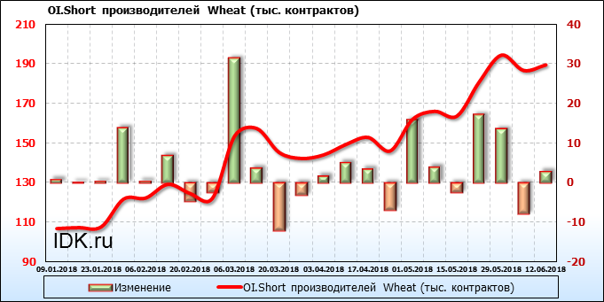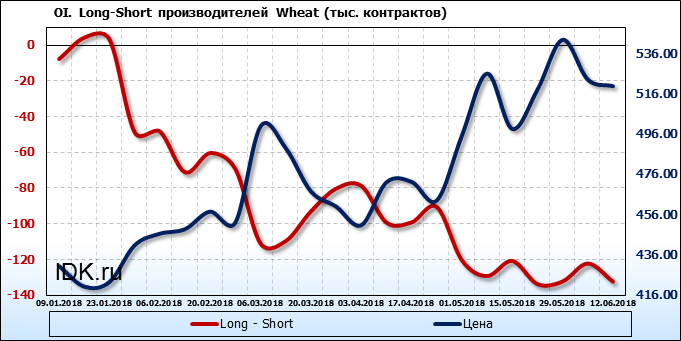 За прошлую неделю, 04.06.18 — 08.06.18, разница между длинными и короткими позициями производителей упала на 10 тыс. контрактов. В тоже время, цена упала на 3.25 цента. Производители наращивают короткие позиции, что не дает цене расти. В такой ситуации на рынке возможно ускорение падения цен.