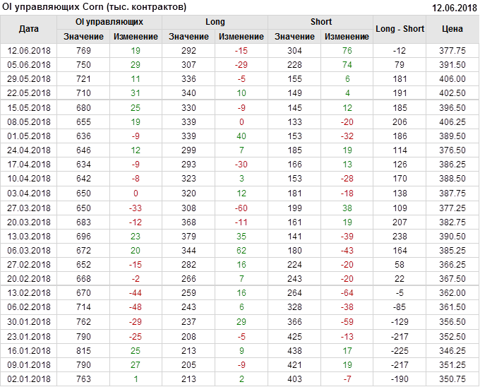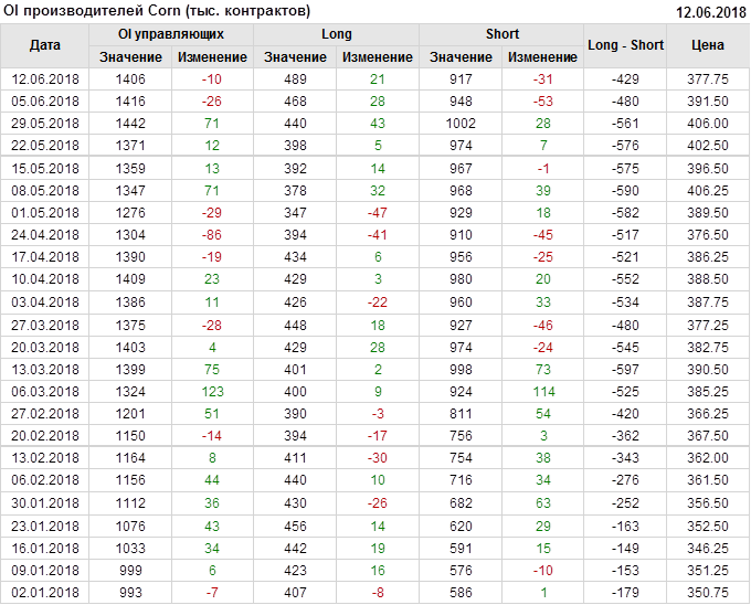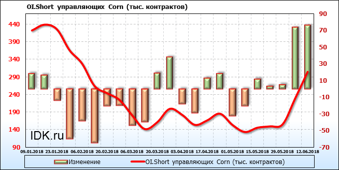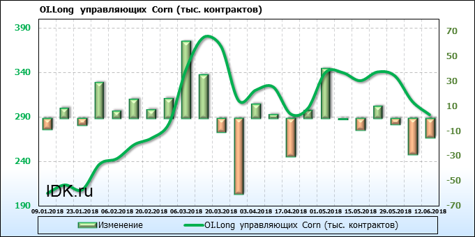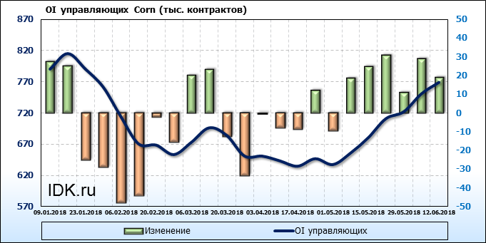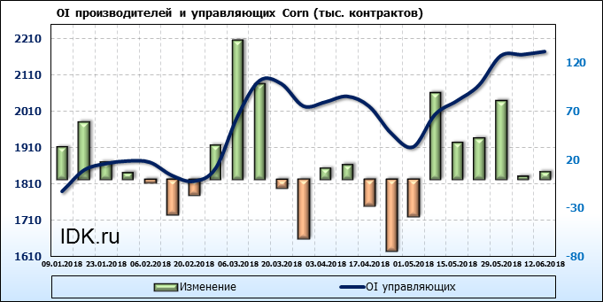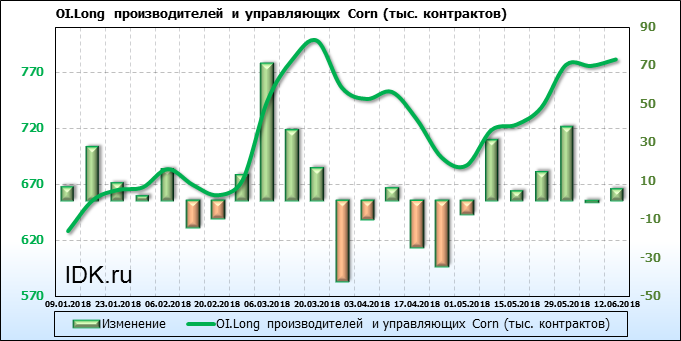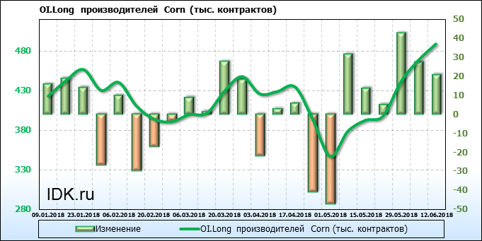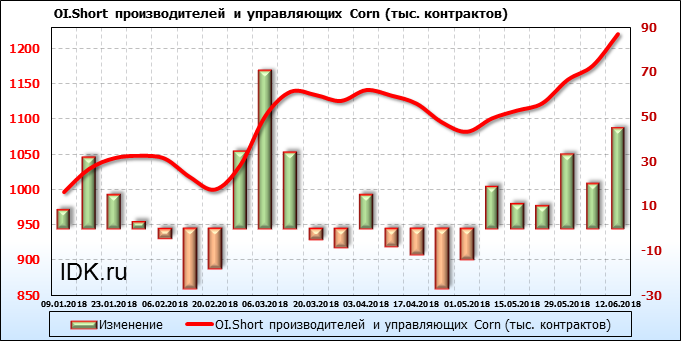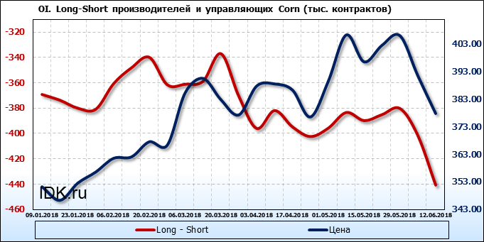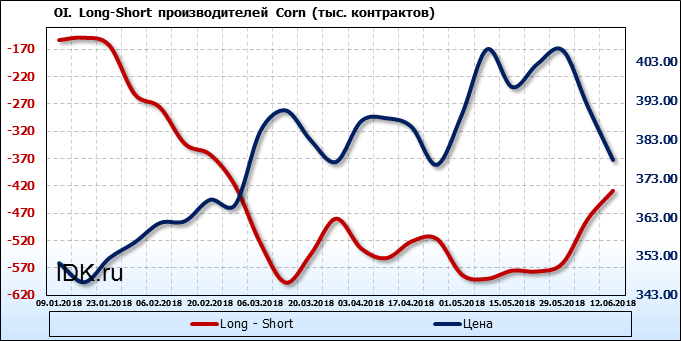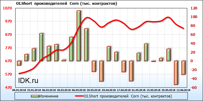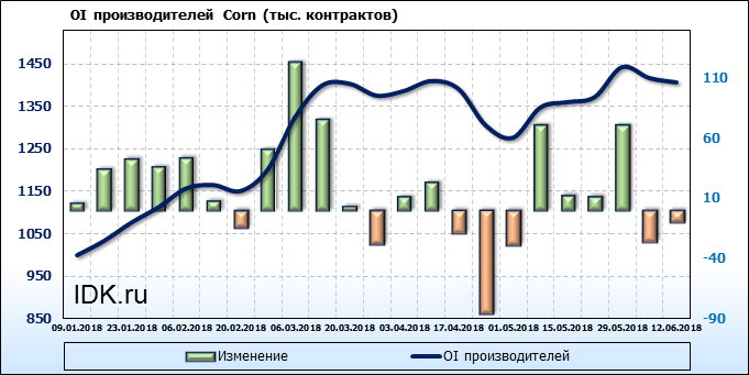 За прошлую неделю, 04.06.18 — 08.06.18, разница между длинными и короткими позициями производителей выросла на 52 тыс. контрактов. В тоже время, цена упала на 13.75 цента. Производители перестали наращивать короткие позиции, что говорит или о непривлекательности текущих ценовых уровней для хеджирования, или о том, что часть участников рынка заняла выжидательную позицию.
