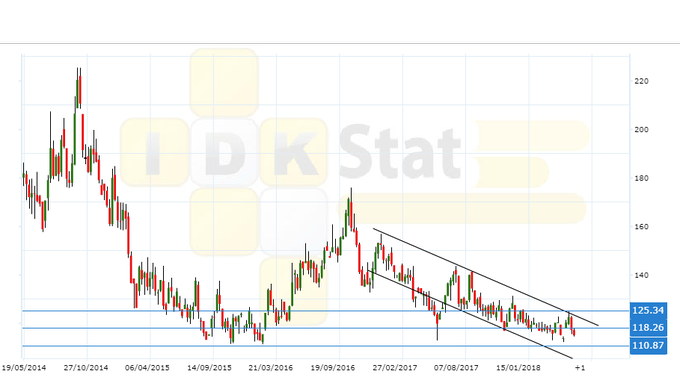 Сценарий роста: смотрим на картинку с историей за последние 4-года. Одна свеча равна одной неделе. Рынку не удалось пока выбраться из падающего канала. Видим продолжение падения котировок. Ранее, подъем к 125.00 обнадеживал, но от него на данный момент ничего не осталось. Не покупаем.