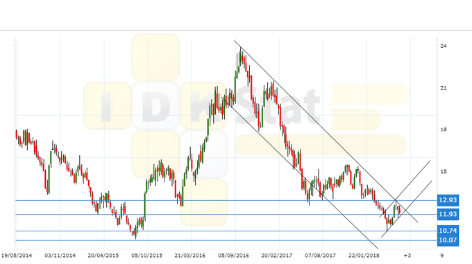 Сценарий роста: для того, чтобы оценить, где мы оказались, смотрим на историю цен за четыре года, одна свеча равна одной неделе. Сдача уровня 12.00 грозит быкам провалом к 11.00, а возможно и к 10.00. Учитывая продолжающийся пессимизм на рынках и тяжелеющий доллар покупать тут тяжело. В лонг не входим.