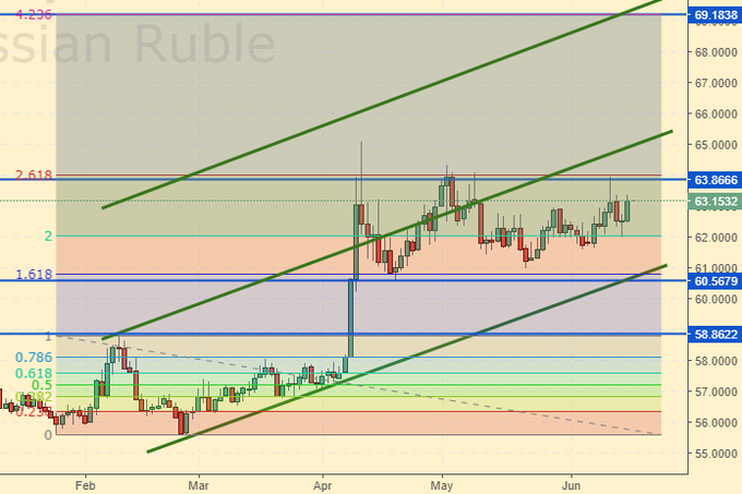 Рубль отметился нервным рывком вверх в пятницу вслед за падающей нефтью и практически вернулся к 63.00. ЦБ РФ в пятницу ставку не повысил, но возможно этого и не стоило делать, так как макроэкономическая ситуация, как может казаться, не так и плоха. Ждем результаты второго квартала, когда станет понятно, что с промышленным производством, строительством и торговлей. ЧМ по футболу может немного помочь, так как все-таки 1,5 миллиона иностранных туристов потратят за месяц пусть 3000 долларов с носа, итого, 4 500 000 000 долларов, что для экономики размером с 1,2 триллиона не слишком.