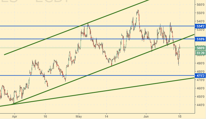 Пшеница: пока рост цен пятницы и начавшегося понедельника выглядит как дежурная коррекция вверх после фазы снижения. Размышлять в обе стороны (и за быков, и за медведей) сегодня смысла никакого не имеет. Мы продолжим рекомендовать продажи с текущих уровней и вплоть до 520.0, так как текущий рост пока лишь может претендовать на тест пробитой ранее линии поддержки.