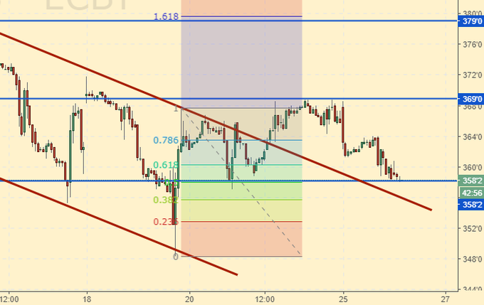 Кукуруза: быков просто вымораживают с рынка периодически прорываясь к каким-то неведанным в последние месяцы глубинам. Кукуруза вновь на 358.0, и есть предпосылки для продолжения падения. Затея с лонгами не удалась. Но должны быть и те, кто продавал и держал стоп на 369.0. Сейчас топ можно передвинуть на 365.0. Больше ничего делать не нужно. Ждем. А быки? Быки пока в сторонке стоят.
