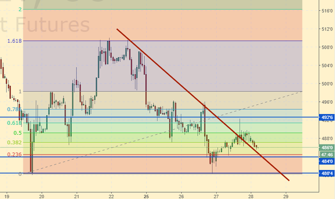 Пшеница: здесь можно покупать фьючерсные контракты. Текущая ситуация располагает именно к покупкам, так как за вчерашний день мы все же увидели от пшеницы тягу к району 500.0. Цены вышли из падающего канала и теперь тестируют его с обратной стороны не в силах пройти ниже и вновь вернуться в него, что полностью бы нивелировало рост двух последних дней. Покупаем.