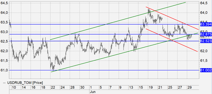 Рубль: будем верить. Сегодня ожидаем укрепления рубля на 50 – 70 копеек. Почему? Потому что нефть весьма дорога, внешних шоков нет. С точки зрения техники мы вышли из растущего канала и теперь должны пройти расстояние равное его ширине от точки пробоя, а это 1 рубль 70 копеек. Таким образом, отметка 61.20 весьма реальна. Но достигнута она будет за несколько дней. Да, все может сломаться, и мы не сможем пройти даже ниже 62.50 если нефть не продолжит дорожать. Поэтому, следим за нефтью и за уровнем 62.50.