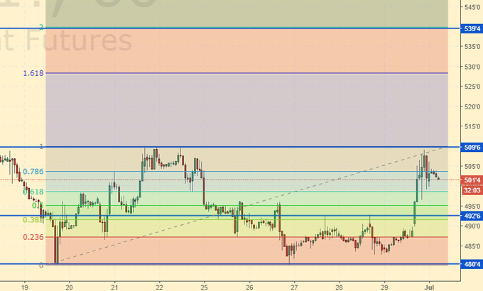 Пшеница: зерновые пытаются восстановиться вслед за нефтью. Рост выше 492.0 должен был вас снова затянуть в покупку. В ней и стоит находиться. Рынок рисует нам «двойное дно». В случае пробоя 510.0 фигура будет сформирована, и мы пойдем на 540.0, благодаря высоте фигуры, которая равна 30 центам. Идея бороться у 510.0 и продавать в расчете на то, что рынок так и не сможет подняться выше, выглядит плохо, так как после неудачной попытки пройти ниже 480.0 медведи утратили контроль за ситуацией.