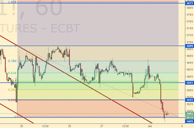 Кукуруза: с покупками ничего интересного не вышло. Кукуруза упала, показав новый локальный минимум. В данной ситуации никаких действий не предпринимаем. Ждем дополнительных сигналов от рынка, которые подсказали бы нам дальнейшие намерения рынка. Даже если цены упадут до 325.0 не стоит сильно переживать. 12 июля выходит отчет USDA, ждут позитивных цифр по урожаю. В момент публикации можно будет купить, рассчитывая, на ход вверх. Как раз мы к этой дате можем оказаться на 325.0.