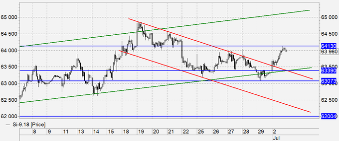 Продажа: при появлении сигналов разворота вниз. Стоп: 64200. Цель: 61700.