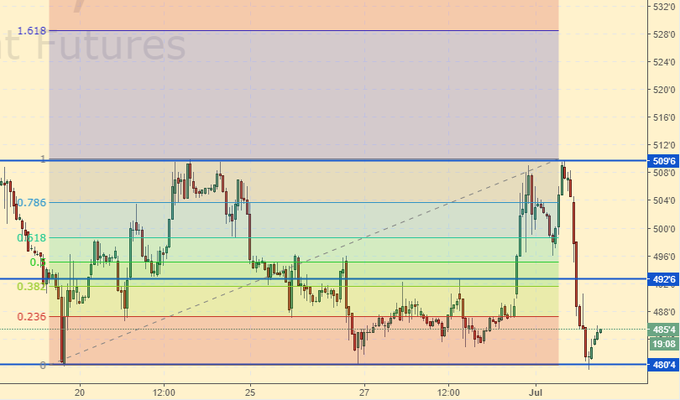 Пшеница: падающая нефть не позволила вчера закрепиться рынку пшеницы выше 510.0. Более того, по бычьим позициям был нанесен сокрушительный удар в виде очередного касания 480.0. Колебания почти в 5% за день здоровыми назвать сложно. С другой стороны, весь анализ упростился. Если мы упадем ниже 480.0 – будем продавать, вырастем выше 510.0 будем покупать. Можно поработать и у краев этого диапазона покупая от 480.0 и продавая от 510.0, но не стоит торопиться. Падение понедельника было очень сильным. На его фоне мы можем ожидать пробоя 480.0 и хода к 450.0.