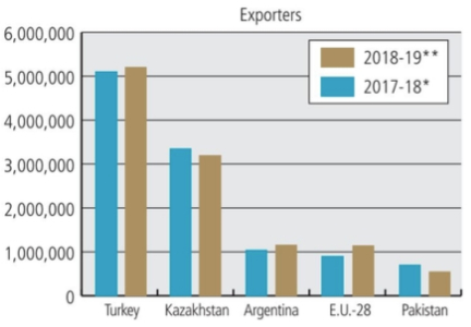 В Турции зарегистрировано снижение на 200 000 тонн до 5,1 млн.; ЕС – на 100 000 тонн до 900 000; США – на 50 000 тонн до 400 000; Аргентина – на 90 000 тонн до 1,05 миллиона.