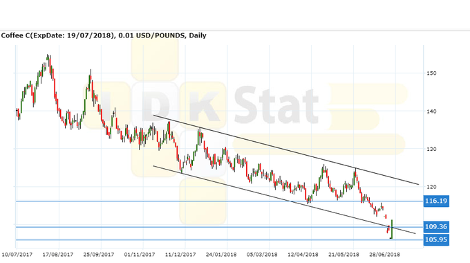 Сценарий роста: рассматриваем июльский фьючерс, дата экспирации 19 июля. Нет, друзья, кофейные трейдеры и плантаторы, мы вам не верим. Труд в странах Африки видимо настолько дешев, что получать прибыль вы можете при любых ценах. Вот эти «любые» цены рынок и устанавливает. Пока не покупаем. Ждем роста выше 116.00.
